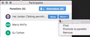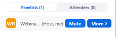 - Choose Participants from the bottom menu to view participants panel. Review the More settings. Click next to their name, Make Host. Review Panelists and Attendees tabs.