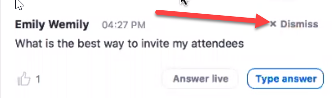 Answered and Dismissed tabs. Dismissed questions can be reopened. Attendees are not notified when the question was dismissed.