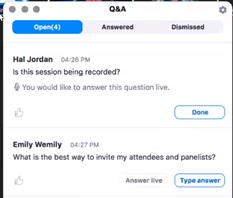 - When attendees ask questions. Options: Type answer, Answer Live, Dismiss, Send Privately, see ratings (thumbs up)