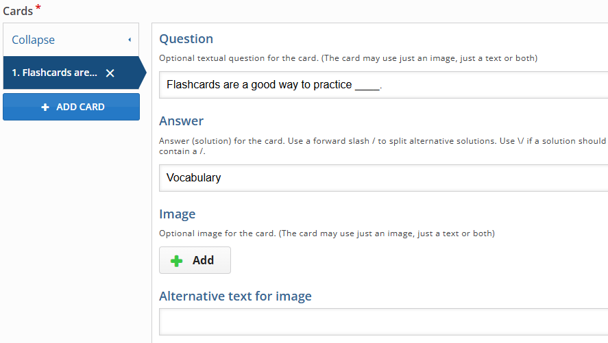 4. Fill in the fields for each Card in your Flashcards activity. Create a Question for each Card, and define the Answer. Under the Image heading, click + Add to add an image to the Card. Remember to include Alternative text for image, if you choose to add one.